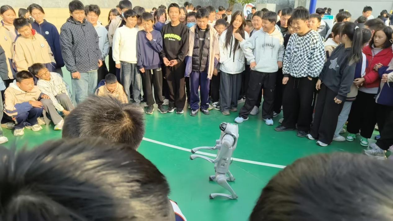 活动现场热闹非凡,各类趣味科普展品前迅速围满了好奇的学生。磁力转盘、“视错觉钟”“懒惰环”等展品前,同学们俯身操作、反复调试,在亲手转动与细致观察中,一步步拆解现象背后的物理原理;“动画”“声驻波”展台旁,大家凑在一起端详、热烈讨论,原本抽象的科学知识变得可触可感、生动鲜活。仿生机器狗的现场表演更是将活动推向高潮,它灵活完成“后空翻”“手势交互”等动作,引得学生们层层围观,惊叹声与掌声在校园里久久回荡。