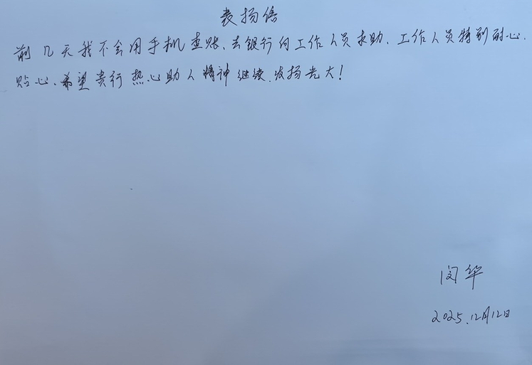 广发银行南昌青山湖支行以暖心服务解决老年客户智能设备操作难题,彰显"金融为民"理念。76岁闵爷爷因子女不在身边,前往网点时向大堂经理求助使用手机查询账户。员工立即放下手头工作,逐步演示操作,在纸上标注关键步骤并录制慢速教学视频,重点讲解转账限额设置、反诈预警等安全要点,确保老人掌握操作要领,客户深受感动为我行手写了表扬信。