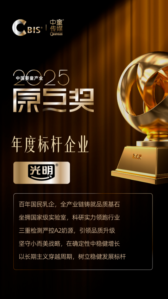 近日,以“智・创未来”为主题的第十二届CBIS中国婴童产业大会在北京盛大举行。作为中国婴童产业发展的深度参与者与重要见证者,已成功举办十二届的CBIS大会,始终紧扣时代脉搏,推动着行业的发展和变革。在备受瞩目的“原点奖”颁奖典礼上,光明乳业凭借在产品创新、渠道赋能、行业贡献等方面的突出表现,一举摘得2025婴童产业原点奖。