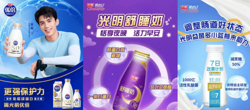 “创新新生”既是超越单一产品迭代的系统性突破,更是深入精准营养、场景无界维度的价值重构。针对不同消费需求,光明乳业打造了多款现象级创新单品。其中光明优倍5.0超鲜牛乳以“更高蛋白、更低负担、更高活性营养”为核心突破点,100ml含5.0g乳蛋白与300mg/L活性免疫球蛋白,重新定义鲜奶营养高标准,精准契合现代人群对健康营养的诉求。光明舒睡奶深耕睡眠场景,以“酪蛋白酶解物+α-乳白蛋白+茶叶茶氨酸”针对性配方助力改善睡眠质量,实现场景化营养的精准落地。光明益菌多小蓝瓶完成全新升级,“7日改善计划”新增“两日控糖,减糖50%”,在守护肠道活力的同时兼顾低糖需求,达成营养与口感的双重平衡。