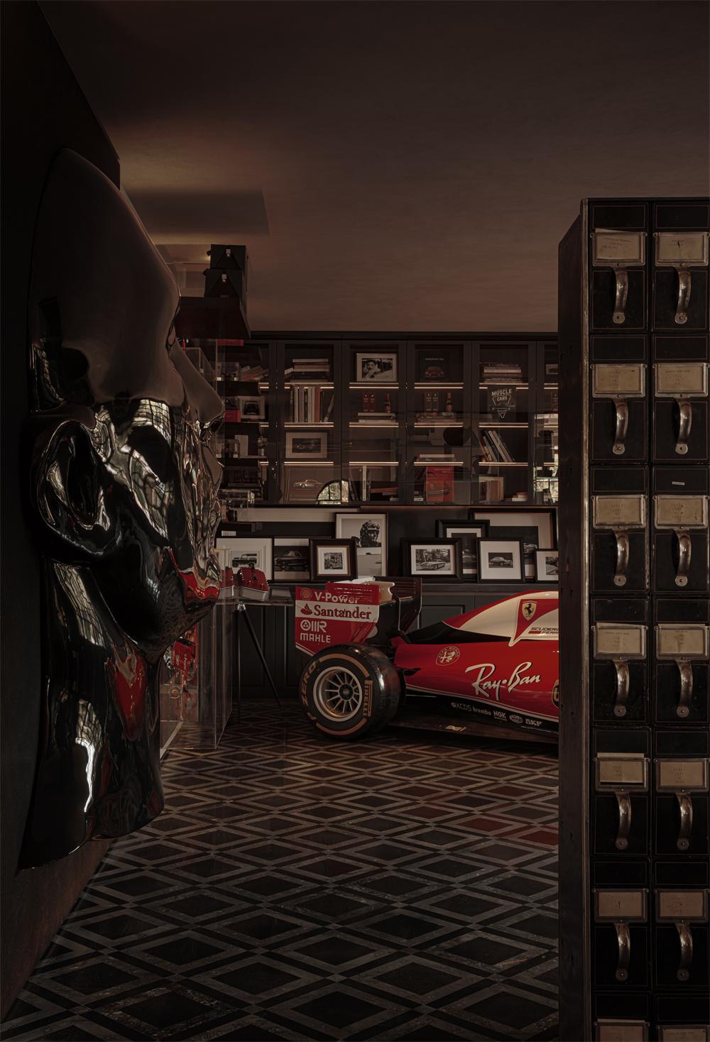 入口右侧的限时展区以深色木材与玻璃构筑的沉稳基调打开文化气场,营造静谧克制的“私人收藏厅”氛围,几何石材地面与博物馆式陈列让机械、速度与文化在此缓缓铺展。作为雍熙荣的首个品牌合作,今年11月,法拉利将Kimi Räikkönen的Ferrari SF16-H(2016 Brazil Grand Prix 原车)及跃马新作Amalfi带入空间,注入鲜明的速度美学。展陈亦引入了经典老爷车收藏——梅赛德斯-奔驰190、路虎卫士SeriesII、阿斯顿·马丁DB4等,以沉稳复古的绅士情怀塑造对话场景,演绎凝聚品味、激发谈资的文化剧场。