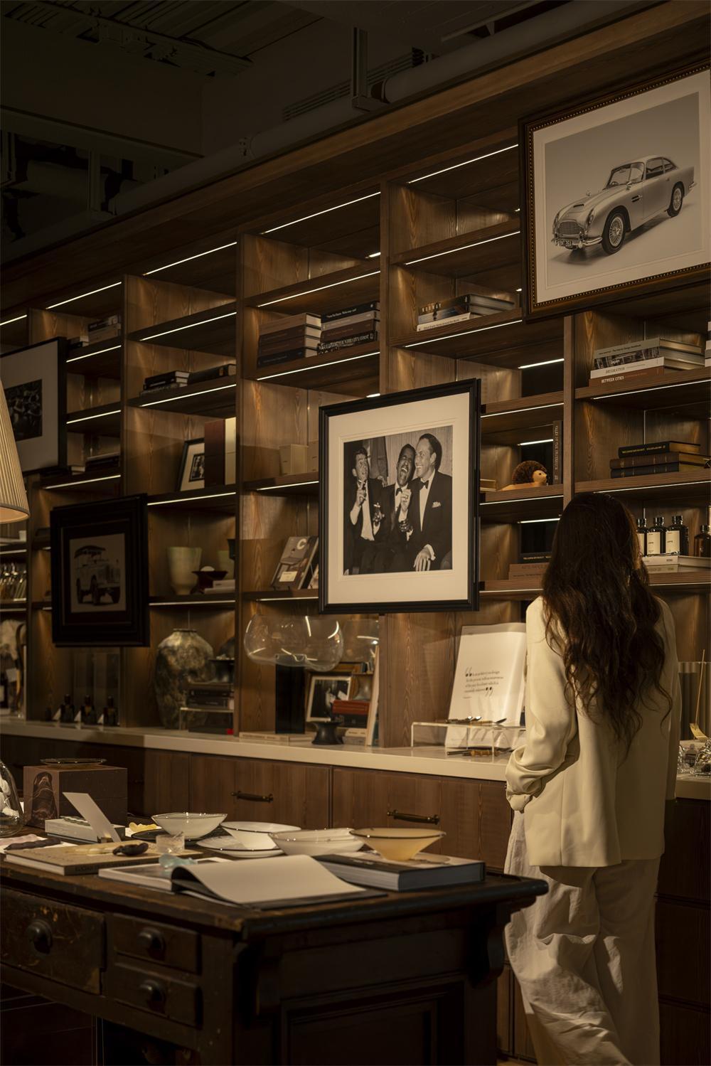 咖啡区右侧的买手店区域以深木色、黑金属与玻璃橱柜构成“策展式零售”结构,将诸如Ralph Lauren Home、Amalgam Collection、Fortnum & Mason、Cire Trudon、CULTIMILANO与APFR等国际高端品牌汇集一处,共同构成雍熙荣独有的审美坐标,形成关于设计、收藏与生活方式的跨界对话。