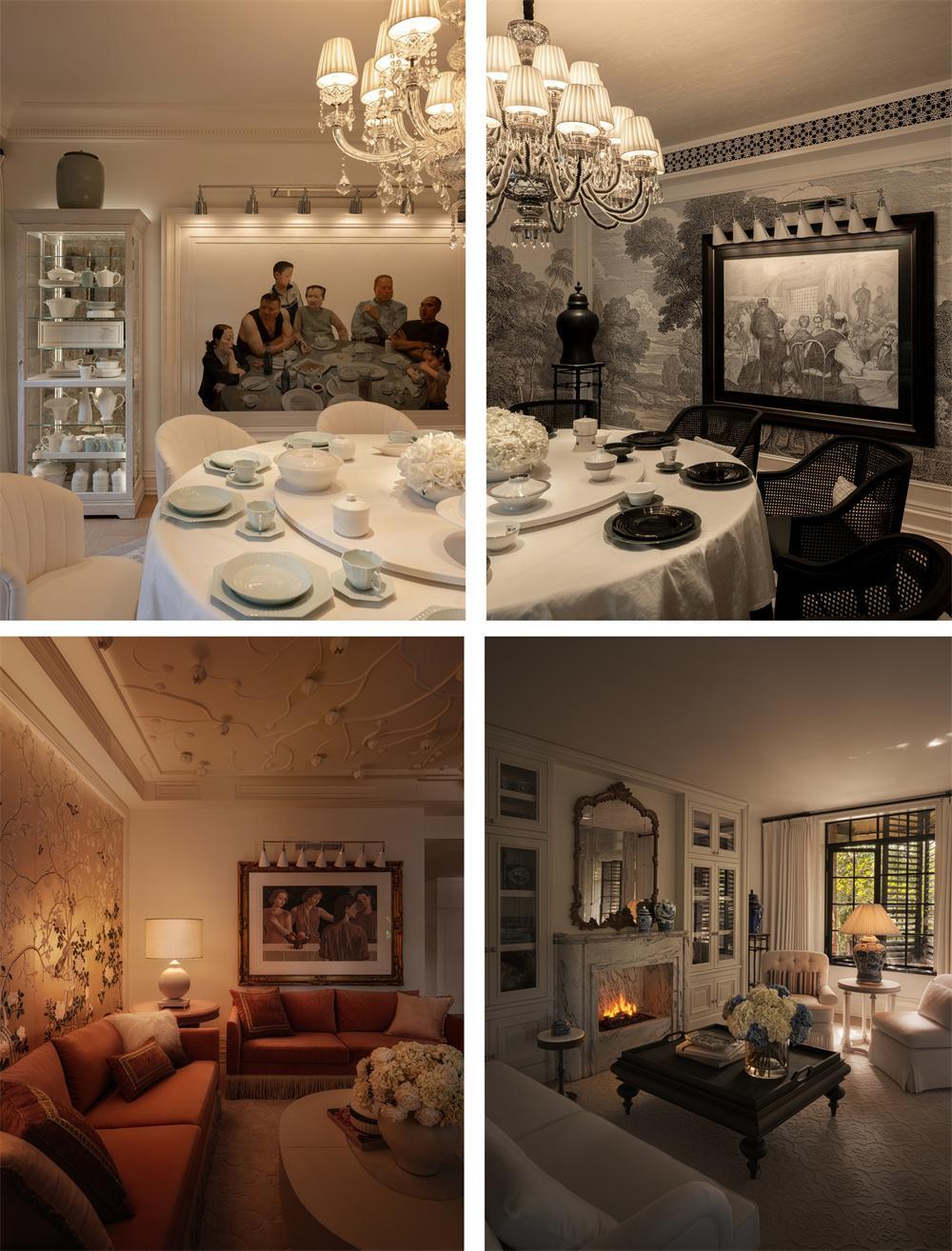 二层包厢以「元初」 「泓影」 「皎岚」 「霓裳」四大主题构筑不同情绪的私宴场景:「元初」融合法式左岸的贵气与东方古董的稳重,以中西器物共融的方式重现17世纪“东方珍宝”进入欧洲的文化脉络;「泓影」以黑白素描语言塑造冷静绅士气质,连通景观最佳露台,使版画风景与真实景致叠合统一;「皎岚」以影青瓷的“月白清影”为基调,为空间带来静谧内敛的雅致气息;「霓裳」专为女性打造,以de Gournay金箔手绘壁纸、粉色丝绒沙发与柔软材质营造松弛优雅的社交氛围,宛如城市中的一间“生活慢室”。搭配THGParis奢华卫浴及多幅收藏级艺术作品,新荣记在雍熙荣实现了味觉、美学与文化的三重融合,让东方餐叙在当代城市语境中拥有了更具深度的艺术表达。