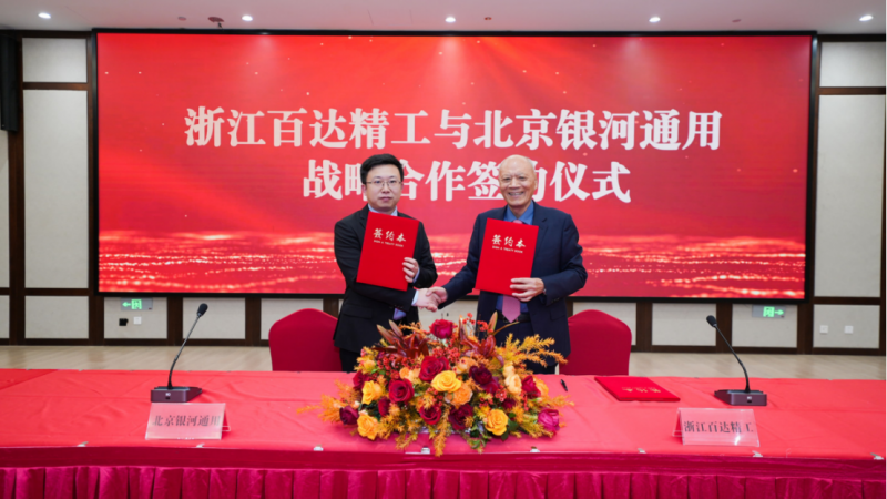 (银河通用联合创始人姚腾洲(左)与精密制造的领先工业企业百达精工董事长施小友(右)签署战略合作)