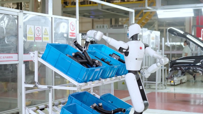 (银河通用机器人GalbotG1在生产线执行物料分拣调试工作)