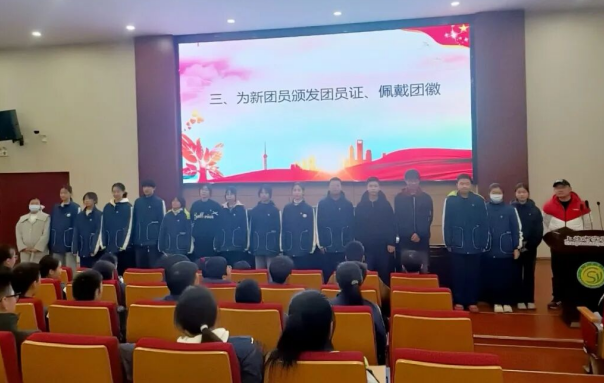 入团仪式环节肃穆庄重,全场肃立齐唱国歌,雄壮旋律激荡胸怀,点燃家国情怀。随后大家共同研学共青团知识,明晰使命、牢记担当;校团委吴柳青宣读新团员名单,百名青年迈入共青团大门。郑亮、吴柳青老师亲手为新团员佩戴团员徽章,金色的团员徽章熠熠生辉,是荣誉更是责任。新团员面向团旗庄严宣誓,字字铿锵许下青春誓言;新老团员代表相继发言,新团员诉初心表决心,老团员传经验寄厚望,现场暖流涌动、信念如磐。