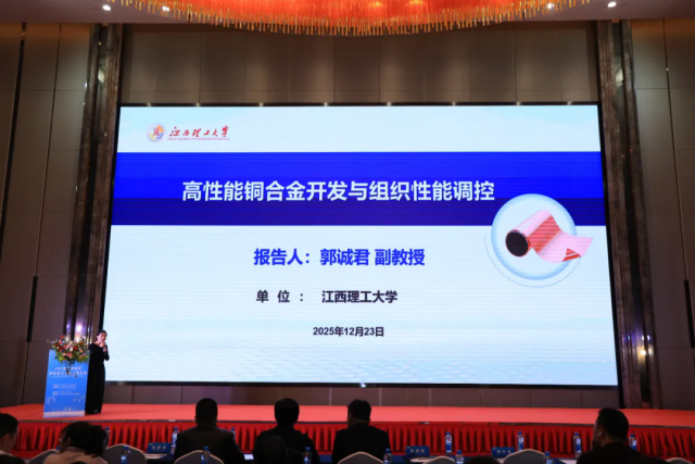 在科研成果分享环节,江西理工大学郭诚君副教授全面介绍了高性能铜合金在新能源汽车、人工智能等新兴领域的应用需求,分享了团队在Cu-Ni-Sn合金、Cu-Ni-Si合金等关键材料研发方面的最新进展,以及通过微合金化、机器学习等方法实现材料性能突破的研究成果。
