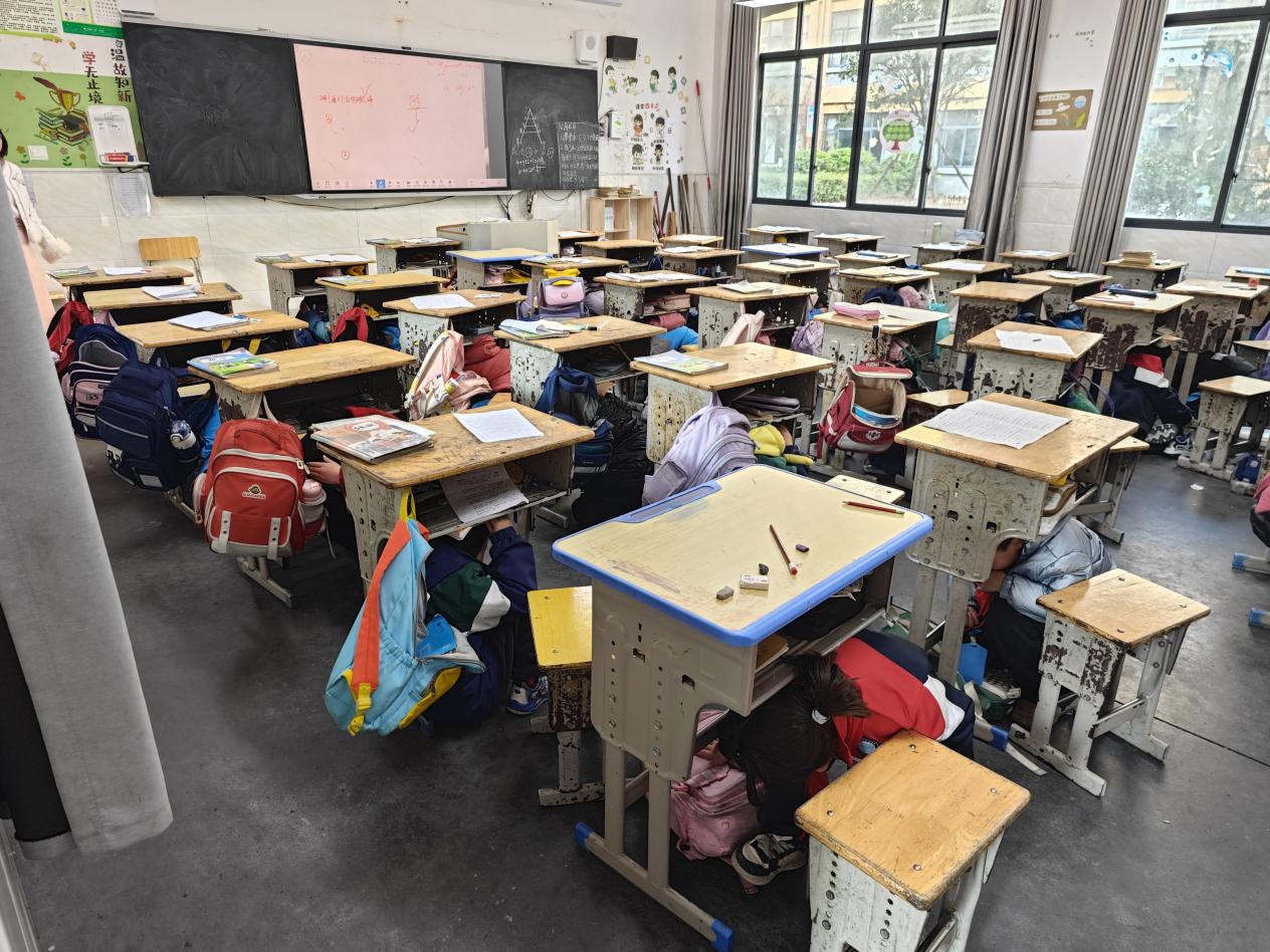 26日,随着尖锐的地震警报声在校园内骤然响起,演练正式启动。各班学生在任课教师的快速指引下,立刻双手抱头、屈膝弯腰,迅速钻进课桌下方或紧靠教室承重墙根,规范完成就地避险动作,整个过程紧张有序、不慌不乱。与此同时,各楼层引导员、值日领导闻令而动,迅速抵达楼梯口、走廊转角等关键位置,为后续疏散做好准备。