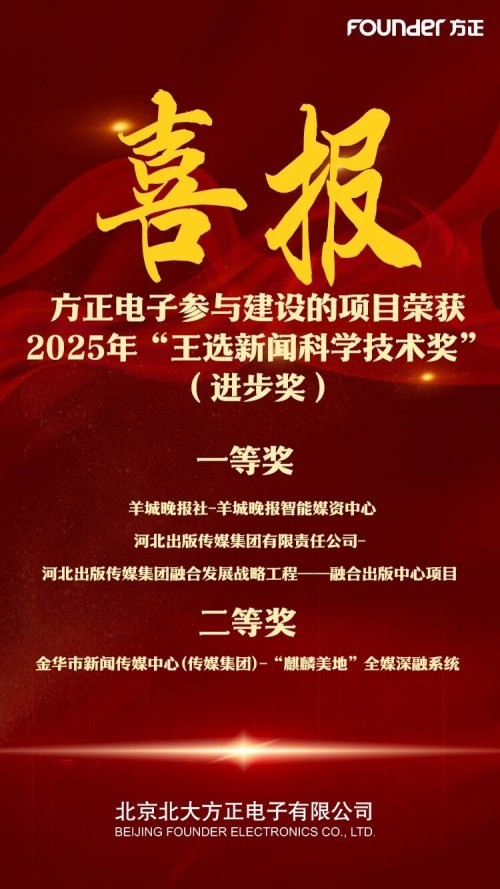 另外,方正电子提供技术支撑的中国青年报社、黑龙江日报报业集团、南方报业传媒集团(南方日报社)、云南日报报业集团、金城出版社、外语教学与研究出版社有限责任公司、吉林省科学技术信息研究所、巴彦淖尔市融媒体中心、宜昌三峡日报新媒体有限责任公司、绥化日报社等媒体用户获得2025年“王选新闻科学技术奖”(进步奖)。获奖项目覆盖央媒、省市级融媒体中心、行业媒体等多类应用场景,涉及智能媒资管理、全媒体生产平台、内容风控、政务融媒体等核心领域,充分体现了方正电子“技术与业务深度融合”的创新理念,为行业提供了可复制的解决方案。