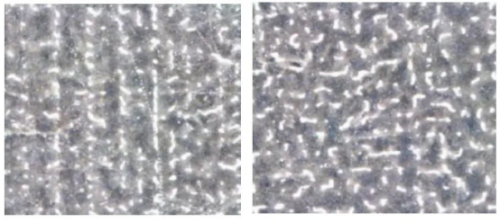 ▲普通喷墨网点(左)与混合网点(右)的光铜拉丝表现对比