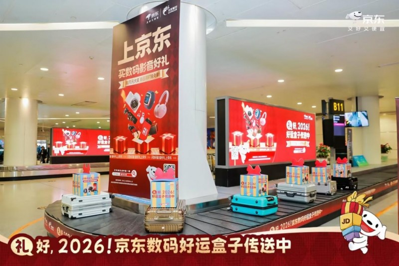 2025年12月28日,京东数码携手杭州萧山机场在行李提取处,打造”好运盒子传送带“,几百个京东数码吸睛礼盒联同乘客行李一同出现在行李转盘上,引来众多乘客围观,搭乘当日幸运航班的旅客可凭登机牌领取专属好运盒子,将空中惊喜延续至地面。同时为了满足其他航班乘客积极参与的需求,京东数码还设置了互动打卡点,更多旅客可以通过参与互动的方式赢取自己的新年好礼。此次创新性营销活动,形成了空中感受氛围吸引兴趣—地面揭晓惊喜—用户自发传播传递好运的完整体验闭环,从而持续强化“买数码好礼上京东”的用户心智!