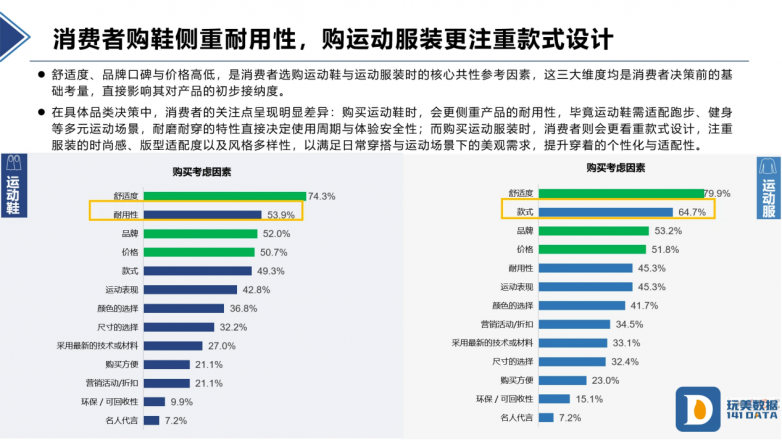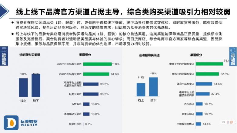 在购买环节中,舒适度、品牌和价格是消费者最多考虑的因素,但对于不同品类还是存在着明显的差异。例如,消费者买鞋时一般会更重视耐用性,以适应多种运动场景;买服装就更在意款式设计与搭配。再说渠道方面,线下门店因可试穿、即时取货成为首选,品牌官方渠道(线上线下)凭借正品与服务保障占据主流,而百货商店、非官方电商等渠道吸引力相对而言就较弱。