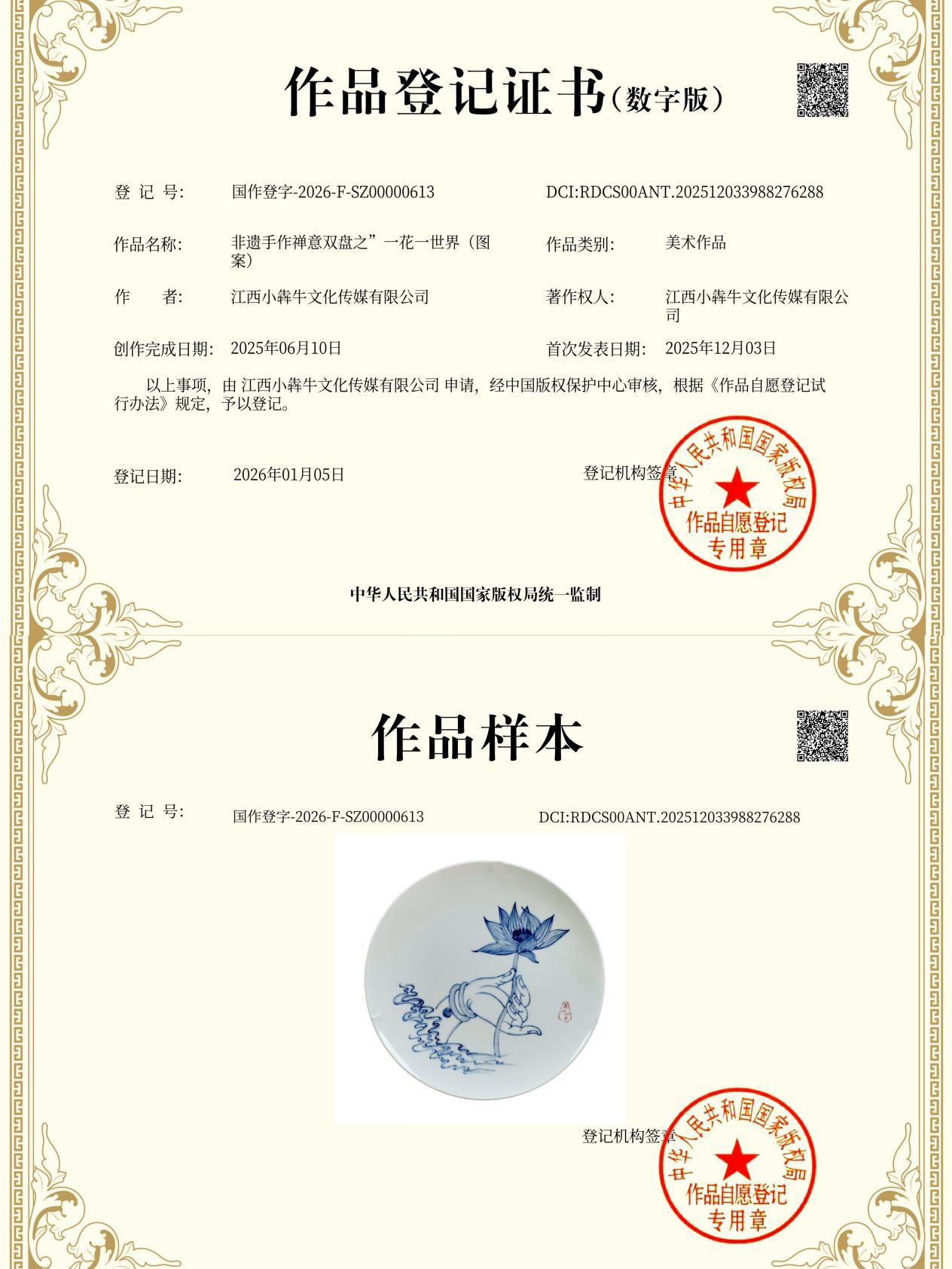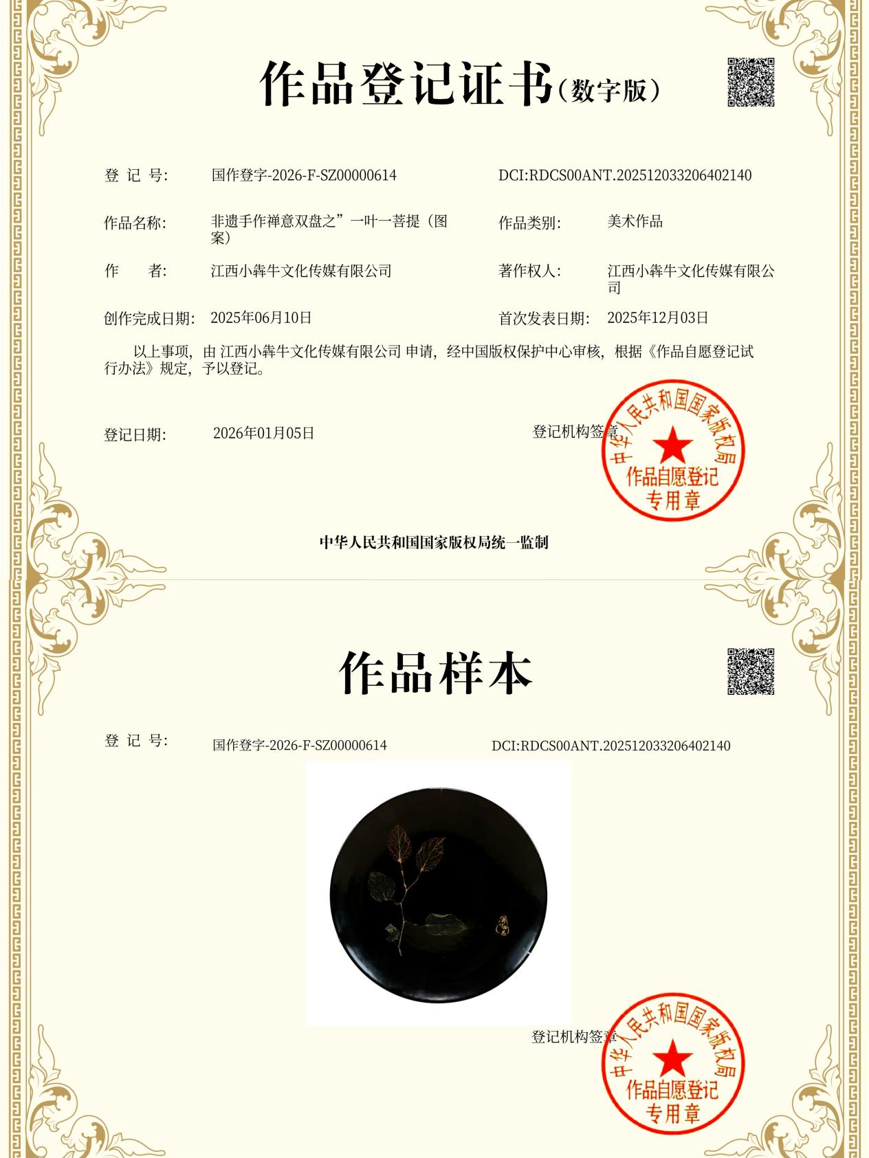 再次,【舞叶拾光】品牌首发推出的“非遗手作禅意双盘”作品获得国家版权登记,在法律层面,有知识产权的长效保护机制。
