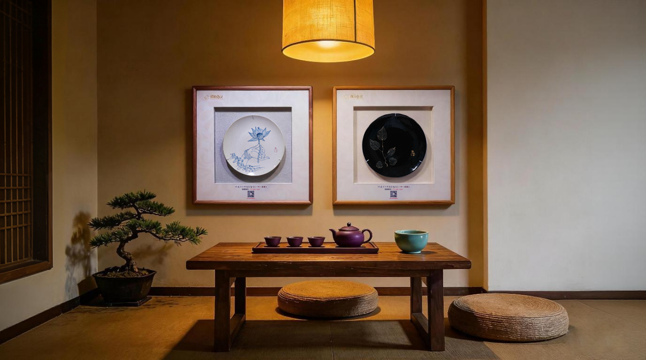 本土新锐陶瓷品牌【舞叶拾光】推出的“活扣式装裱系统”,通过精密的榫卯结构配合柔性内衬设计,实现了瓷盘在画框内的“一秒无损取放”,彻底解决了传统装裱方式对文物级瓷器造成的不可逆损伤。
