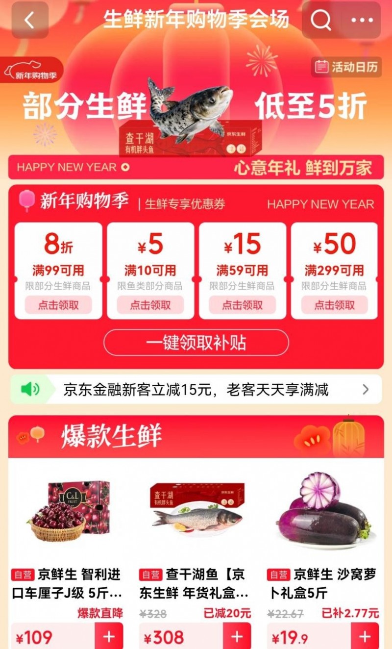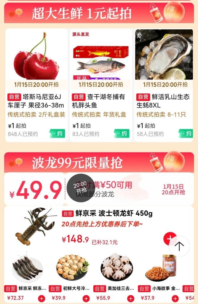 6J级车厘子1元起拍、99元波龙限量抢,京东生鲜新年购物季多款爆品5折