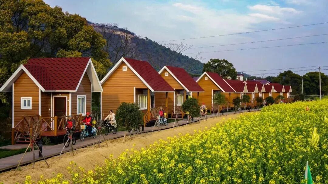 木屋离地六十公分架起,既隔绝了潮湿,又让视野恰好越过摇曳的竹林,落在开阔的田园与流淌的河面上。踩上一米五宽的实木过道,木质的温润触感从鞋底蔓延开来,与空气中青草和泥土的芬芳缠绕在一起。推开门扉,星级配置的房间明亮整洁,一次性用品齐全,小冰箱静静伫立在角落,等待收纳山野的新鲜馈赠。最动人的是那扇朝向花海的窗,晨起时,霞光为木屋披上金氅,推窗便撞进满眼花木,荷花的粉、葵花的黄、草木的绿交织成画,鸟鸣声从林间传来,清脆得如同天籁。