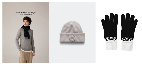 添置外套的同时,搭配上帽子、围巾和手套“组团”御寒,保暖效果才会加倍。JohnstonsofElgin羊绒围巾,采用100%山羊绒+苏格兰工坊30多道工序,14种色彩任选还能定制绣字。更适合男生的加拿大鹅Arctic托克帽,纯美利奴羊毛+特殊染色技术,每顶都是独一无二的。BURBERRY羊绒混纺绒线手套,黑白撞色拼接融合品牌字符设计,保暖又时尚。