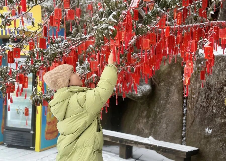 气温回升后,漫山白雪将逐步消融,“雪映祈福”的独特景致转瞬即逝。别让犹豫变成遗憾,趁雪色未消、晴空正好,奔赴灵山,在银装仙境中赏雪寻趣,在红绸祈愿里寄托心安,沉浸式解锁这场“赏雪+祈福”的冬日限定邀约,美美出片不留遗憾!