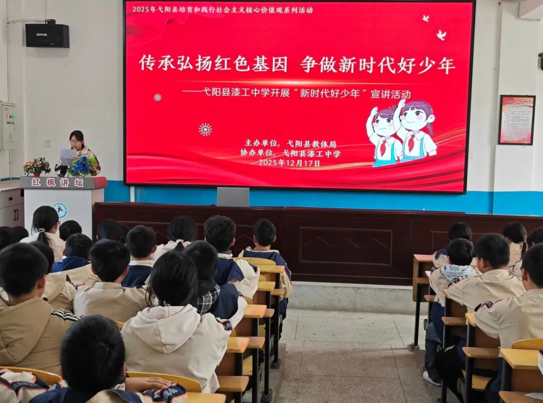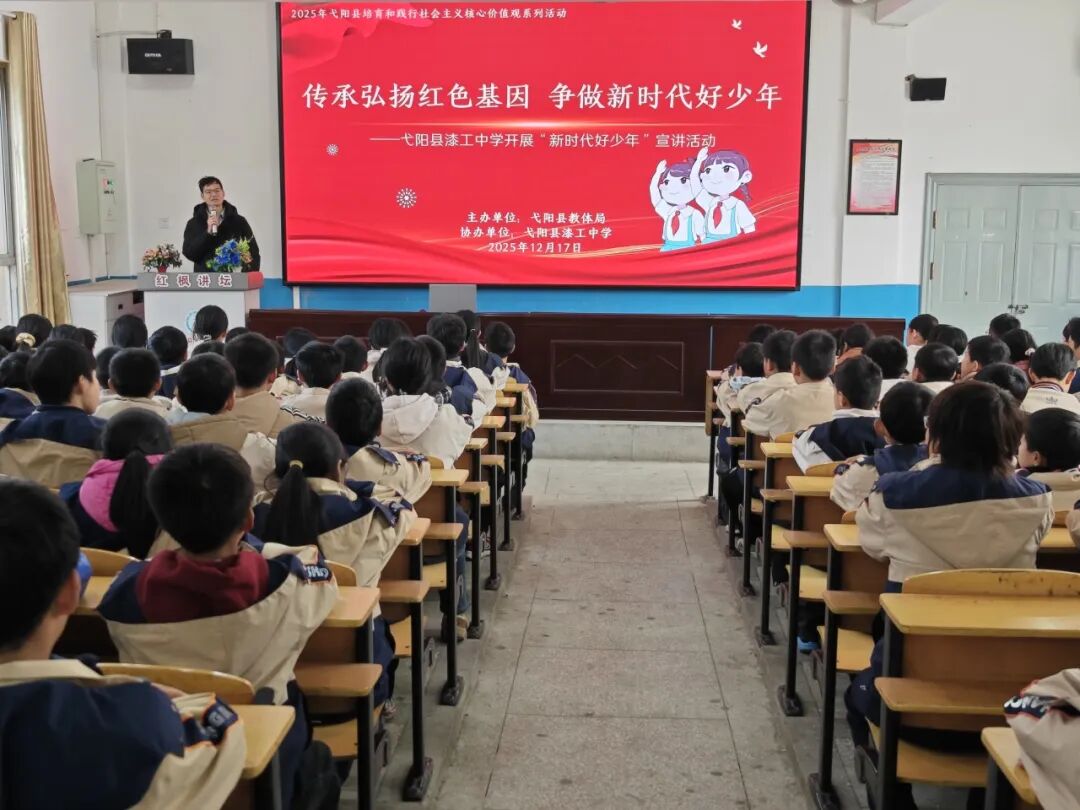 为深入学习贯彻社会主义核心价值观,充分发挥新时代好少年的示范引领作用,弋阳县漆工中学开展“传承弘扬红色基因争做新时代好少年”主题宣讲活动。