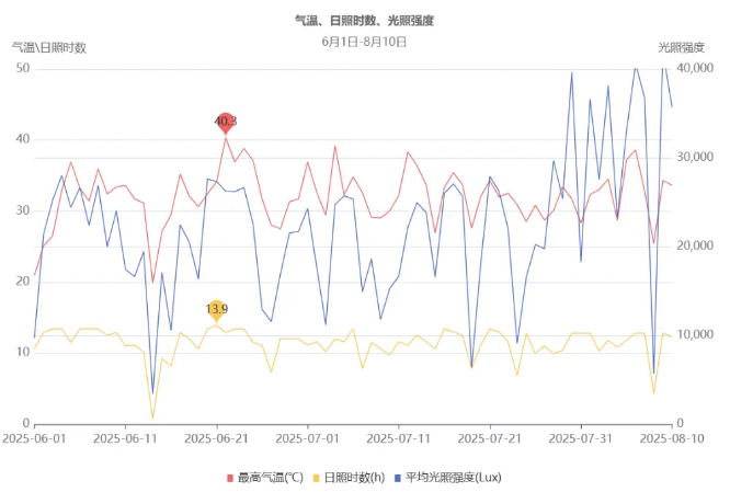 夏至(6月21日)天地却先奏响了一段绵长的阴郁序曲。此前连续八日,霖雨不辍,降雨量53.7 mm,平均温度22.1℃。夏至当天云开雾散,日照时数冲至全年最高13.9 h,自此,果实生长期正式步入光热的华章,平均日照时数11.5h,平均光照强度21246.6Lux,可谓“日头如火,沃野流金”。这般丰沛的光照,正是葡萄果实积累风味、深度催化着果皮中酚类物质的合成与成熟。