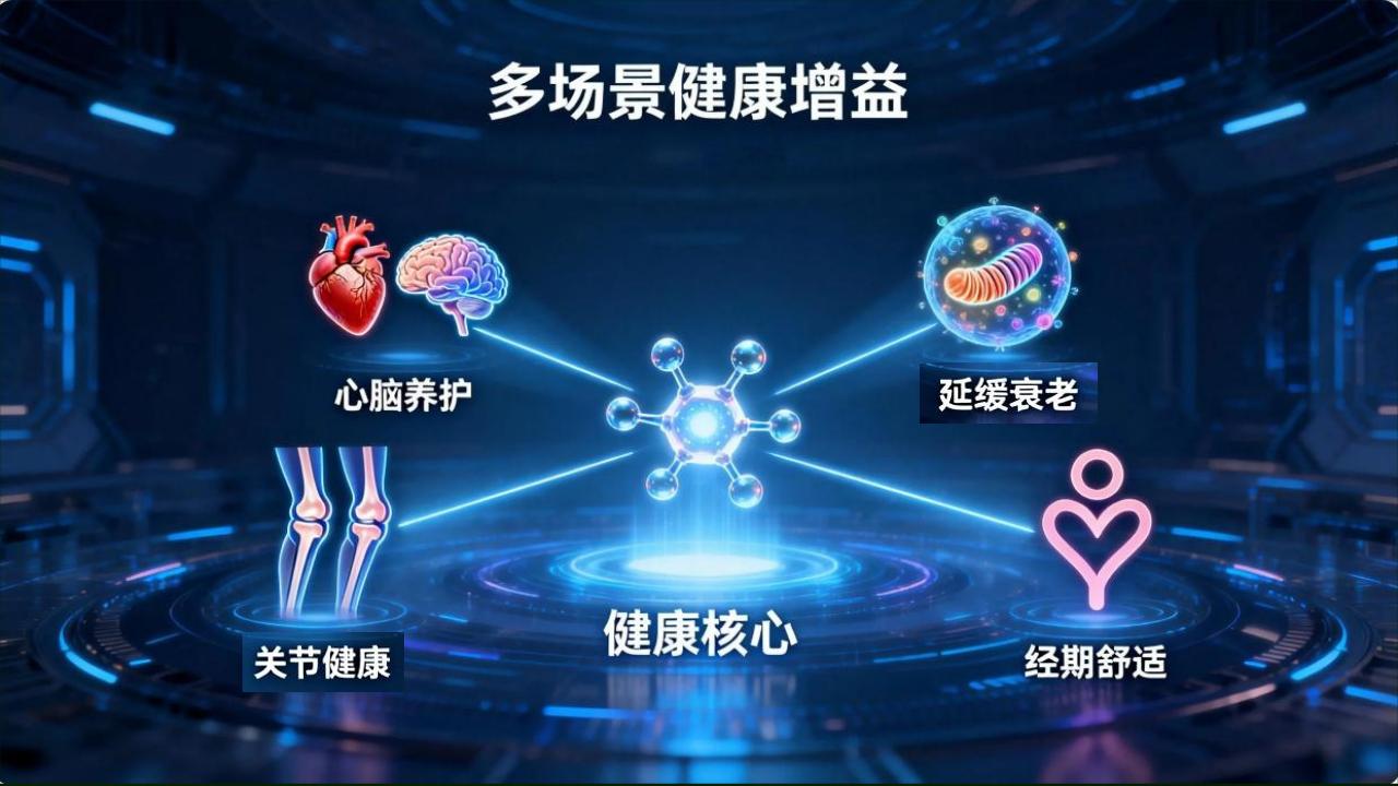 多场景健康增益:预防和抑制骨关节炎、风湿性关节炎进展,减轻疼痛与僵硬;提升脑部血管氧合血红蛋白浓度,促进神经元健康,改善学习能力与认知表现;调控衰老相关转录程序,保护多巴胺神经元,改善线粒体健康,减缓细胞与组织衰老;对经期浮肿、腹痛、情绪波动等症状的改善效果显著,优于传统鱼油。