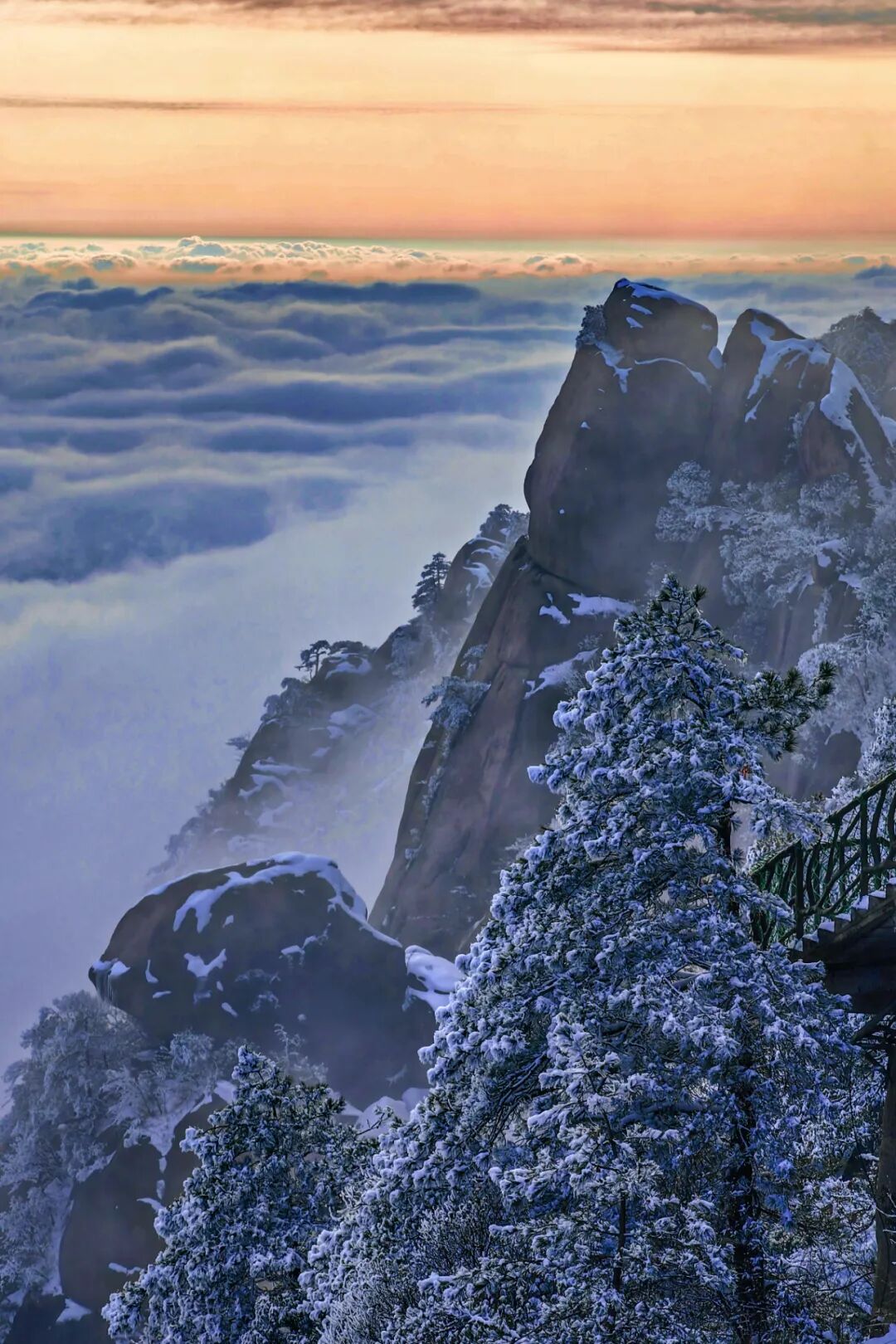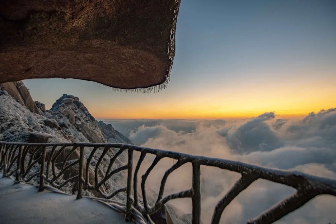 云顶栈道上的云海翻涌着白雪