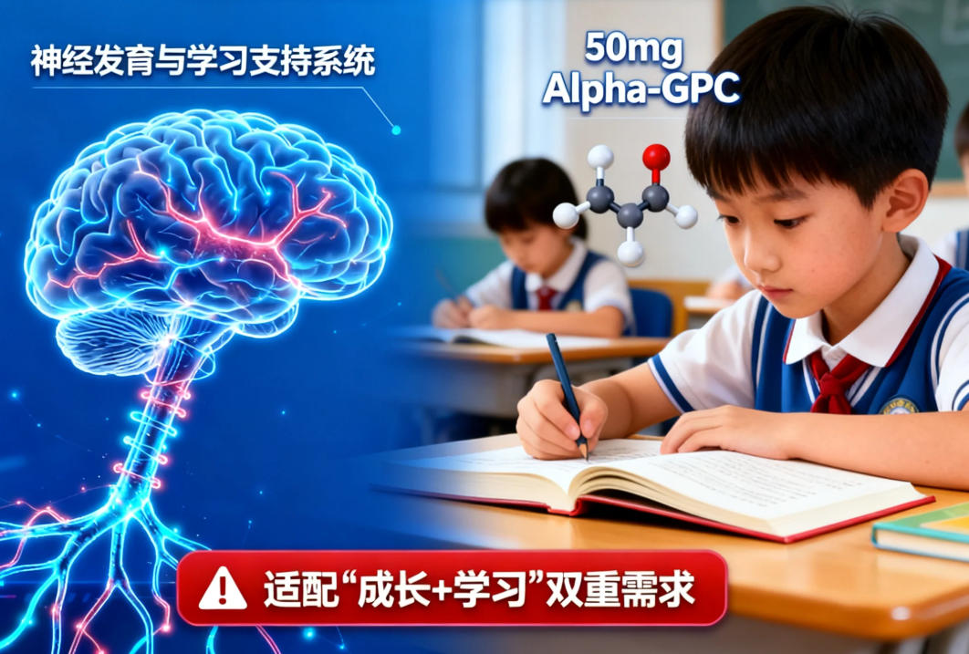 4.神经发育与学习支持系统:50mgAlpha-GPC,助力儿童注意力、记忆力提升,适配学龄儿童“成长+学习”双重需求;