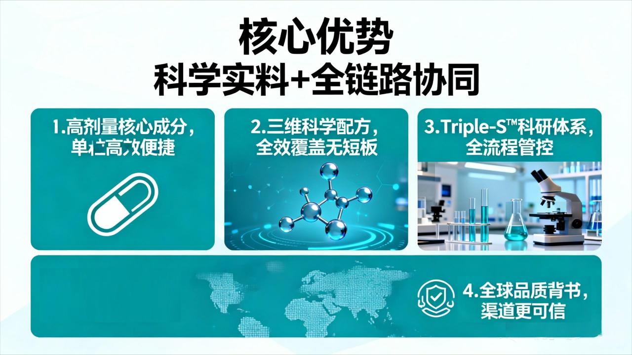 【核心需求】全球科研背景、成分剂量精准、多国际标准验证,长期服用更安心。