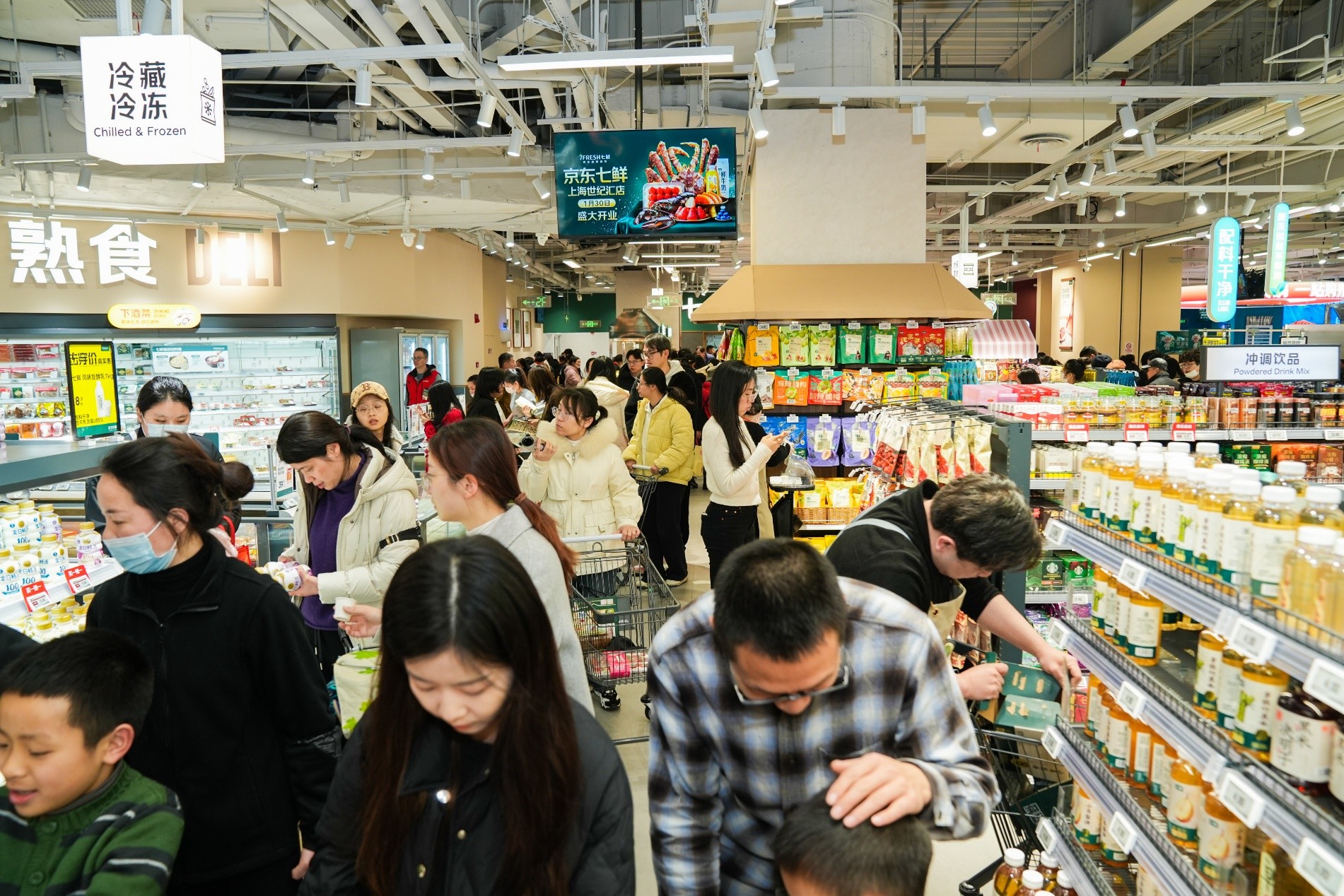 1月30日,京东七鲜超市上海浦东首店在世纪汇商场正式迎客,卖场内人潮涌动、烟火气十足。开业前门口便排起长队,正式营业后,人群瞬间涌入,各类商品货架前迅速被围满,一场围绕“鲜”与“本”的购物热潮,在浦江东岸热烈上演。据统计,开业首日,共有近3万消费者来到京东七鲜超市世纪汇店消费。崇明本地菜、本帮熟食、鲜活水产、进口商品、网红烘焙、七鲜自有品牌等商品频频补货,用实力点燃浦东新春消费热潮,成为沪上市民打卡囤货的新地标。