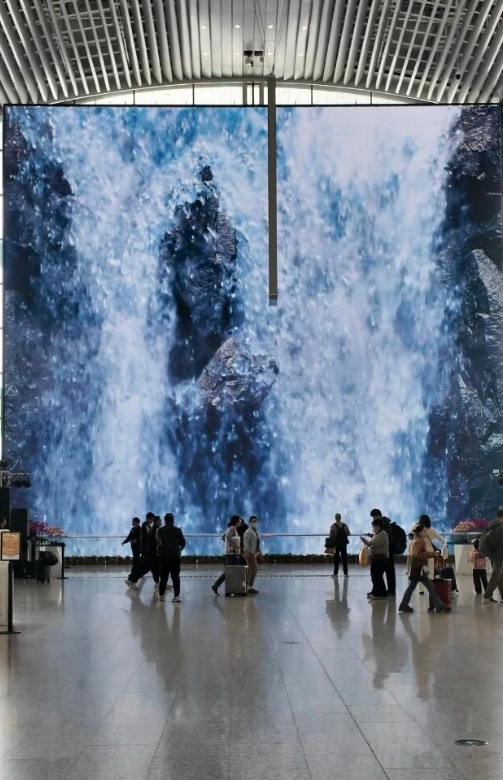 作为整场展演的开篇与收尾,利亚德励丰文化通过裸眼3D技术打造的《水景瀑布》构建出极具沉浸感的数字山水空间。潺潺流水从33米高的巨幕上奔涌而下,旅客在航站楼内也能身临其境地感受岭南山水的秀美与灵性,实现了科技与自然的诗意融合。