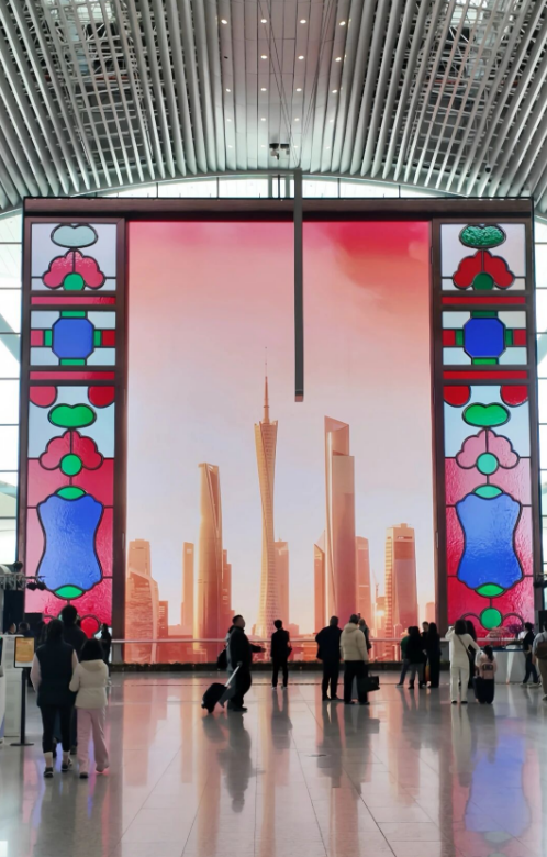 《广州之窗》将巨幕巧妙转化为一扇巨大的、充满呼吸感的动态满洲窗,从朝阳下的城市天际线到缀满木棉花的纪念堂,让旅客透过屏幕读懂广州的历史底蕴与现代活力。