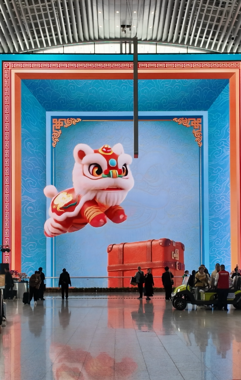 《醒狮献瑞》中一只眼碌碌、肥嘟嘟,有着机长制服同款纹样的“飞机狮”经由行李箱堆叠的“梅花桩”阵,将南狮文化与机场出行场景完美融合。这只威武又可爱的“飞机狮”,正如现场仪式中所述,代表着岭南习俗中的醒狮纳福,为每一位旅客带来吉祥与兴旺。