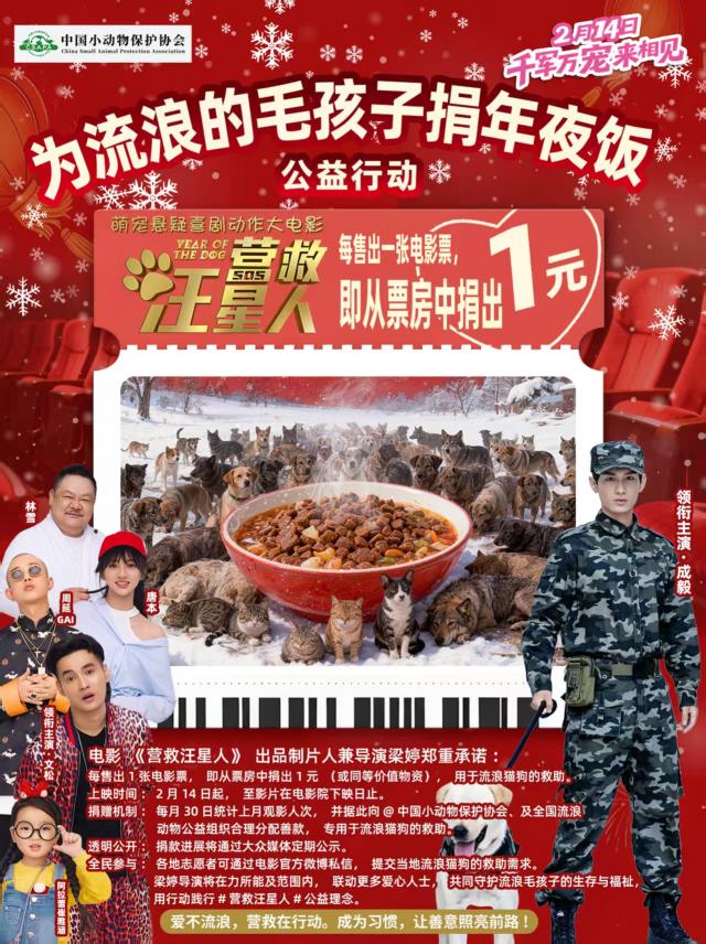 春节将至,针对流浪猫狗可能面临的生存困境,萌宠合家欢电影《营救汪星人》发起“为流浪毛孩子捐年夜饭”公益行动,以观影消费传递公益力量,影片定档 2026年2月14日全国大规模正式上映。