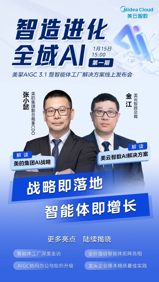 作为6场直播的系列发布会首发活动,美的集团副总裁兼CDO张小懿与美云智数总裁金江,分别从战略高度与实践层面,共同探索AI技术赋能制造业的创新路径:张小懿以“场景驱动+技术赋能”为核心框架,深入解析美的在AIGC领域的落地策略;金江则结合一线实践,详述美云智数如何通过数字化与AI技术的深度协同,打通制造业全价值链,推动产业降本提效。