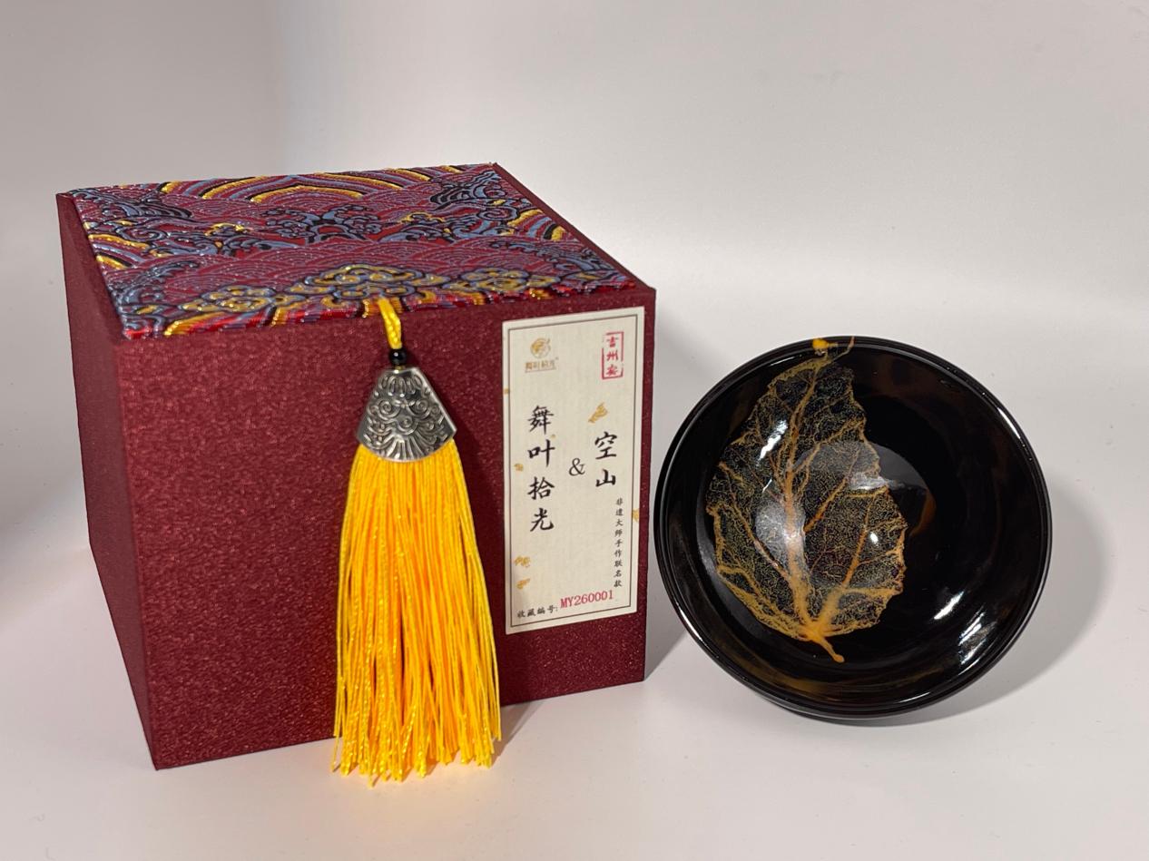 “木叶天目盏,最独特之处在于‘木叶无双’。”江西小犇牛传媒旗下新锐陶瓷品牌【舞叶拾光】运营总监王梓沣指着一盏茶器说。盏中,一片桑叶脉络清晰,仿佛随时会在茶汤中漂浮起舞——这项将天然树叶经高温窑变永久留存在釉中的技艺,是吉州窑独步天下的绝技。