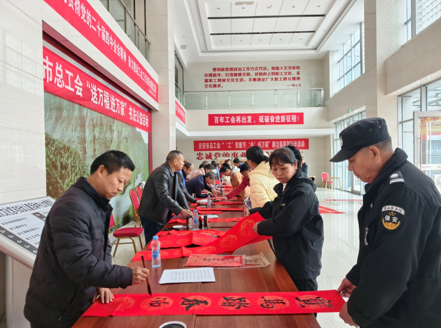 挥毫书福字,墨暖百姓家。近日,“强基工程”新春特别行动——2026丙午马年江西省书协“万福迎春”公益活动分别在吉州区华厦江岸星城小区、吉安市总工会举行。公益活动由吉安市书协、吉安市总工会、吉州区书协、吉安市青年书协、吉州区北门桥社区等主办,为广大市民群众送上真挚的新春祝福,为即将到来的新春佳节增添了浓浓的文化氛围。