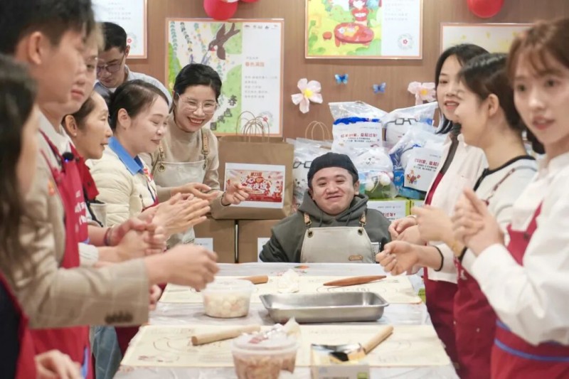 值得一提的是,本次活动的技术指导团队格外特殊——他们来自爱达福公益饺子店,员工多为残障伙伴,涵盖罕见病、肢体障碍、听语障碍等群体。在教学过程中,他们不再是传统认知中的“受助者”,而是传授技能、展现价值的“指导者”。