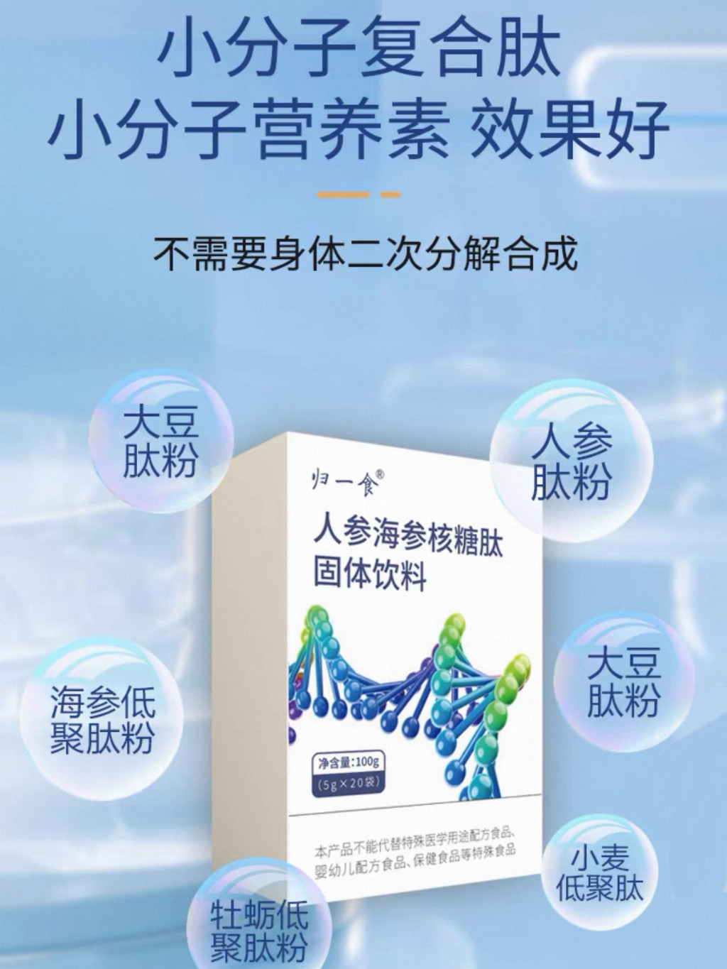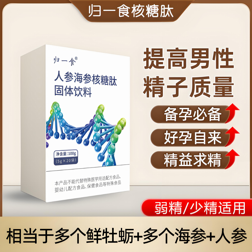 2.小分子肽类产品相比传统滋补品,优势在哪里?答:小分子肽类产品最大优势是吸收效率高,可直接被机体吸收利用,无需复杂消化过程,能快速作用于生殖细胞与代谢靶点。归一食人参海参核糖肽的多重肽类成分协同作用,既能精准改善精子质量,又能兼顾抗疲劳、强免疫等全身养护,比传统单一滋补品更适合备孕及亚健康人群。