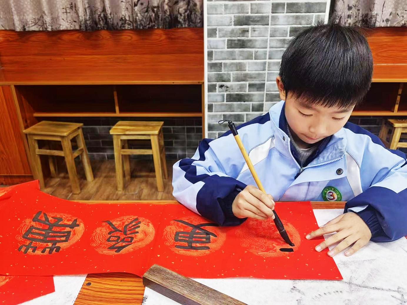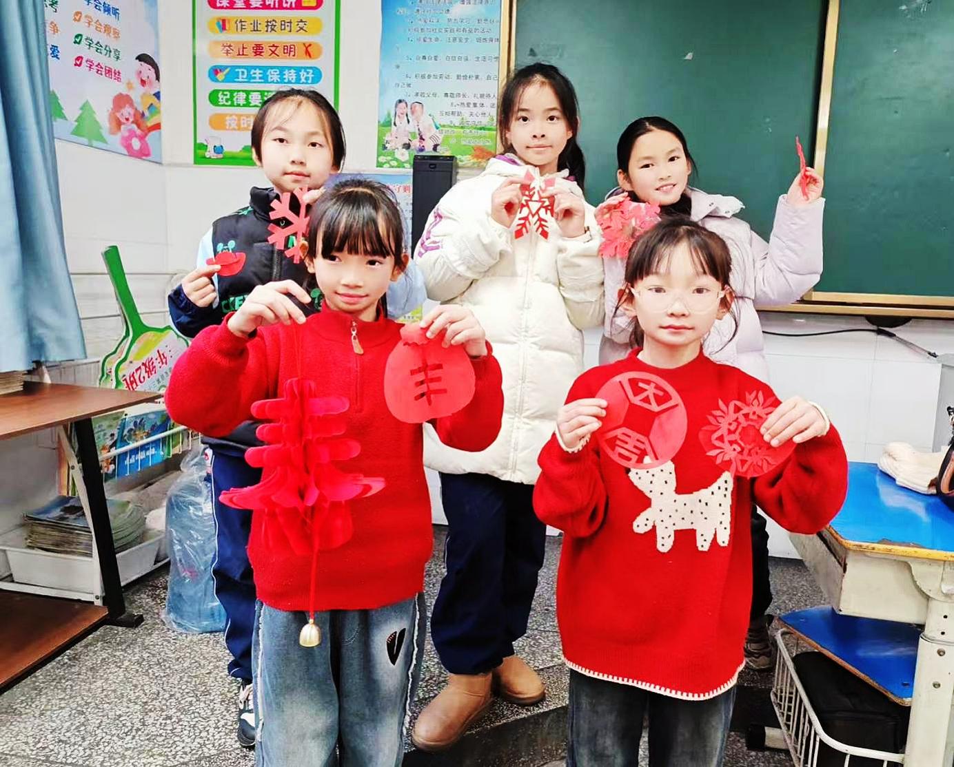 三、四年级的“民俗传承,年味进阶”活动,以“动手实践”为核心,让学生在笔墨挥洒与指尖翻飞中感受民俗文化的鲜活魅力。校园和家里,墨香与红纸相映成趣,学生们在老师和家长的指导下,有的手握毛笔一笔一画书写简易春联与福字;有的专注钻研剪纸技艺,折叠、裁剪间,一张张红纸化作寓意吉祥的福字、小巧玲珑的灯笼与灵动可爱的小马造型。课后,大家将亲手创作的作品精心装点教室,让浓郁的年味在校园每个角落蔓延,也让民俗文化在实践体验中深深扎根心底。