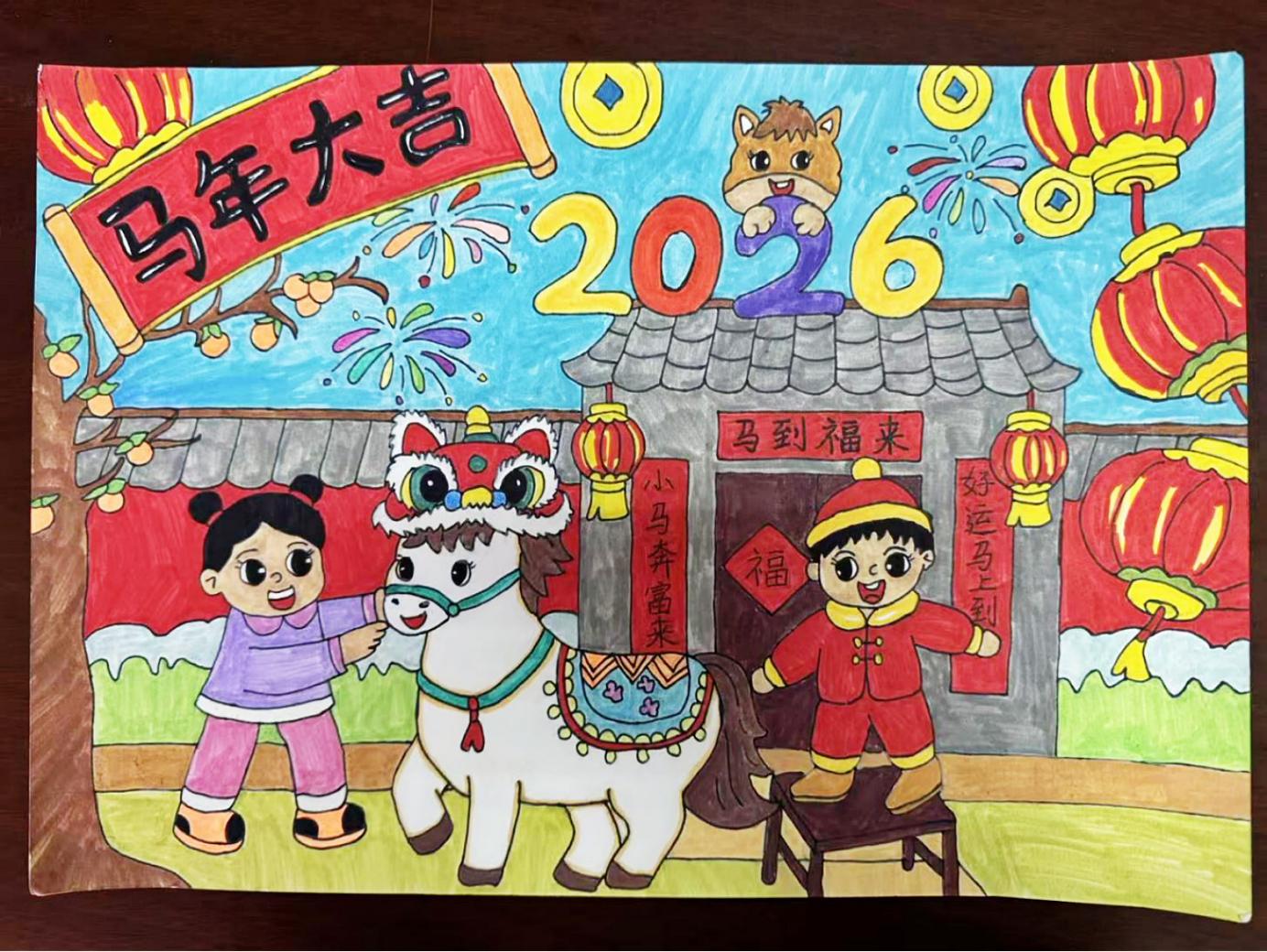 低年级的教室里,孩子们以“新年吉祥”“可爱小马”为创作核心,拿起五彩画笔尽情挥洒想象:有的勾勒出身披红绸、奔腾跳跃的小马;有的描绘了红灯高挂、福字临门的新春图景。一幅幅充满童真的画作,不仅展现了孩子们的艺术天赋,更定格了对新年的美好期盼。