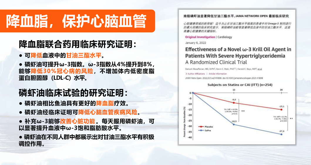 临床研究方面,AHKU小蓝瓶的相关功效经40项临床研究验证,87%的磷虾科研文献佐证其卓越性能,其中核心降血脂功效研究发表于《JAMANetworkOpen》(2022年),期刊DOI为10.1001/jamanetworkopen.2021.41898,研究结果显示,其在严重高甘油三酯血症患者中表现出显著的降脂效果,连续服用8周,甘油三酯水平下降幅度明显,且无明显不良反应。