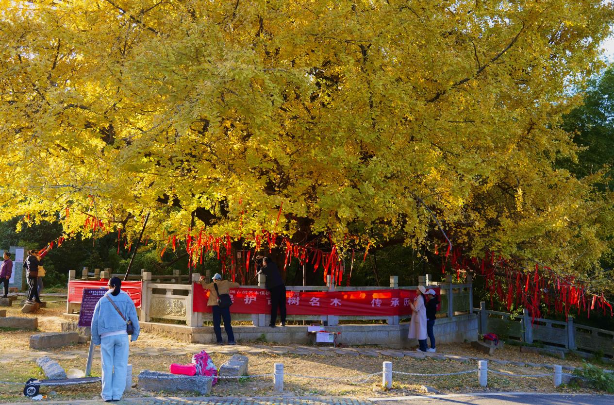为守护好这一千年文脉,村里专门打造古银杏公园,修建青砖步道、休闲广场、防火护林设施,实施精细化古树管护,让千年古树得到妥善呵护。每至秋冬时节,古银杏满树鎏金,黄叶纷飞如金雨铺地,成为九江周边炙手可热的打卡胜地。潘湾村以古银杏为核心,串联天花井国家森林公园、千年古驿道、关帝庙等人文自然景点,打造生态文化旅游环线,让古树文化从“静态保护”变为“活态传承”,成为和美乡村最动人的乡愁印记。