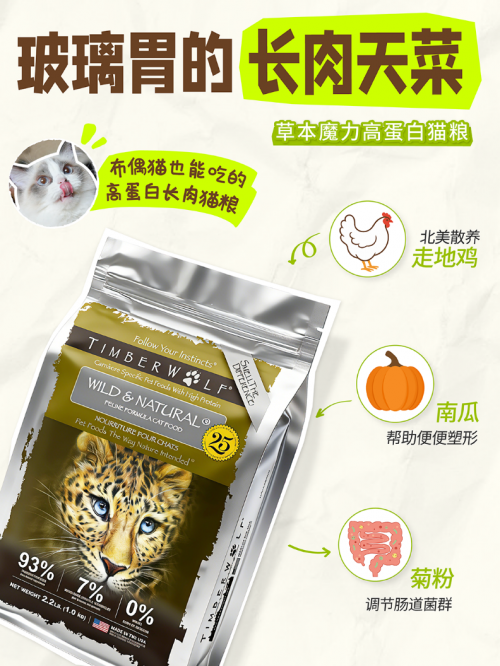营养数据更是堪称 “进口粮卷王”:粗蛋白实测≥50%,碳水化合物含量低于 10%,是市面上碳水含量极低的猫粮之一,营养水平接近生骨肉,能让猫咪摄入的营养精准转化为肌肉,而非脂肪堆积导致的虚胖。同时配方0谷物添加,搭配菊粉、干菠菜、苹果、蓝莓等天然成分,既能补充膳食纤维,调节肠道,又能提供天然维生素,减少肠胃刺激,长肉又低敏。