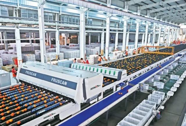 赣南脐橙作为赣南老区百万果农的“致富果”,连续11年蝉联全国区域品牌(地理标志)百强榜水果类榜首。图为2025年11月16日,在赣州市信丰县的江西虔城溢香果业有限公司车间里,一台由本地企业研发的脐橙分选设备正高效运转,智能分选脐橙。赣南日报记者刘青/摄