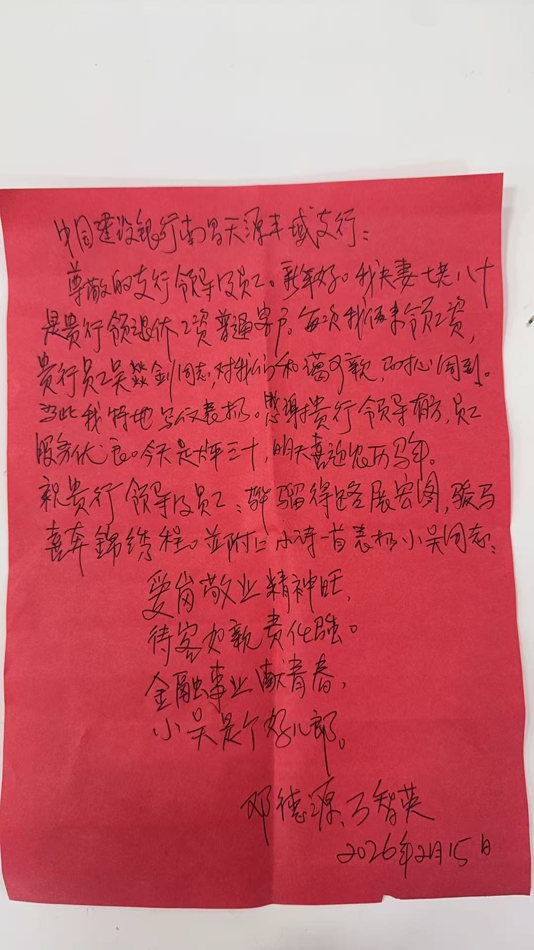 “爱岗敬业精神旺,待客如亲责任强。”在老人给吴燚钊的表扬信中,表达了他们对这位年轻同志的赞赏和感谢。每一个字句都饱含着深厚的情感,彰显了小吴同志身上所具备的高尚品质和对职业的热爱,这不仅温暖了老人们的心,也激励着整个支行的员工更加努力地服务每一位客户。