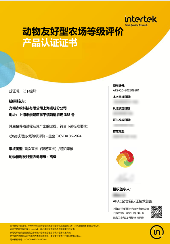 与此同时,光明肉业旗下专注于养殖环节的光明农牧科技有限公司上海崇明分公司,在动物福利领域取得突破性进展,成功获得国内首张《动物友好型农场等级评价-生猪》证书,成为国内首批通过此项认证的企业。