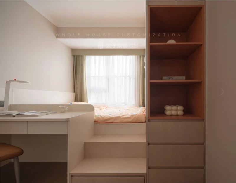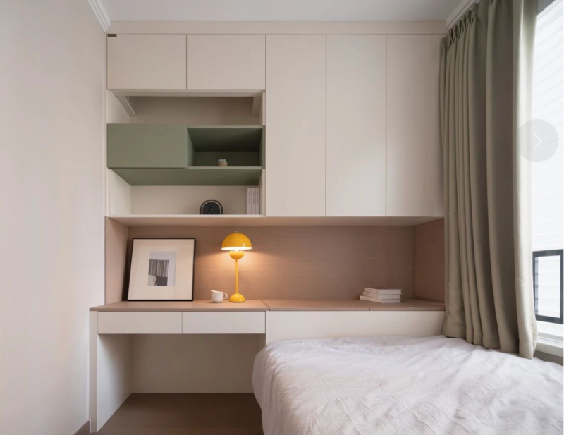 次卧的整体家具定制中,太子家居也把低饱和的橄榄绿、橙色融合到定制柜、桌椅中,这种小面积的色彩点缀,不仅保留了空间整体的简洁和高雅风格,也让空间变得温馨起来。