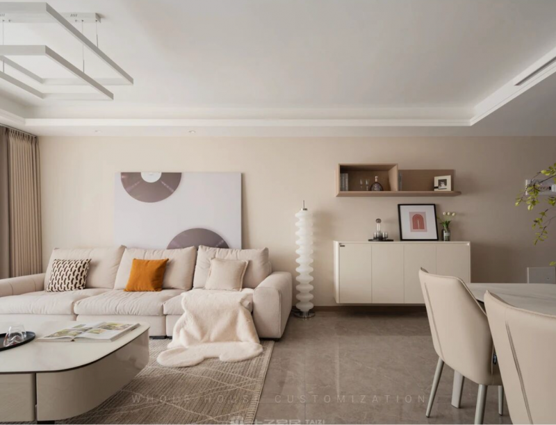 首先看到的是客厅,整体以米色、白色为主调,营造出宽敞明亮且优雅的空间感;沙发、茶几、餐桌色调一致,融入色彩感的挂画、抱枕打破沉闷,让整个空间瞬间活泼起来。若有阳光洒进来,照在定制柜细腻的面板上,泛起柔和的光泽,那种高级的质感立刻就显现出来了。这时候,不管是窝在沙发里追剧,还是发发呆,都能让人卸下疲惫,真正享受一段安静、慵懒的美好时光。