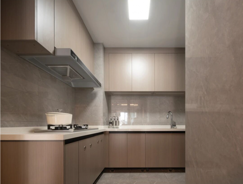 厨房整体设计追求简洁高效,L型布局经过量身定制,完美贴合户型结构,洗、切、炒动线一气呵成。视觉上,太子家居把灰色大理石纹理墙面与浅木色橱柜形成经典搭配,冷暖色调中和,既有现代风的利落,又不失家的温馨感。这也得益于太子家居的高端整体家具定制,橱柜线条干净利落,柜体与墙面严丝合缝,不仅大大提升了空间利用率,更在细节处彰显出高级质感。功能分区划分清晰,收纳井井有条,让下厨变得轻松愉悦,为您营造出一个宁静而实用的烹饪环境。