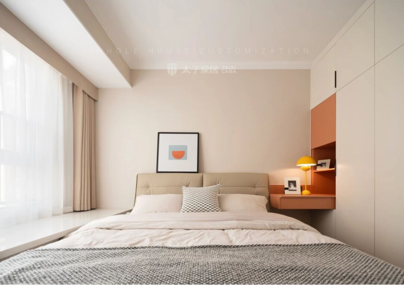 来到卧室,卧室以纯净白色为主基调,营造出干净明亮的休憩氛围。太子家居高端整体家具定制巧妙捕捉春日灵感,在定制衣柜的设计中大胆融入活力橘色调。这款定制衣柜不仅颜值出众,更兼具实用性。内部结构根据生活习惯量身布局,分区合理,收纳无忧。橘色与白色的时尚碰撞,既保留了现代简约的利落感,又增添了温馨的生活气息,让整个卧室充满春天的生机与活力。